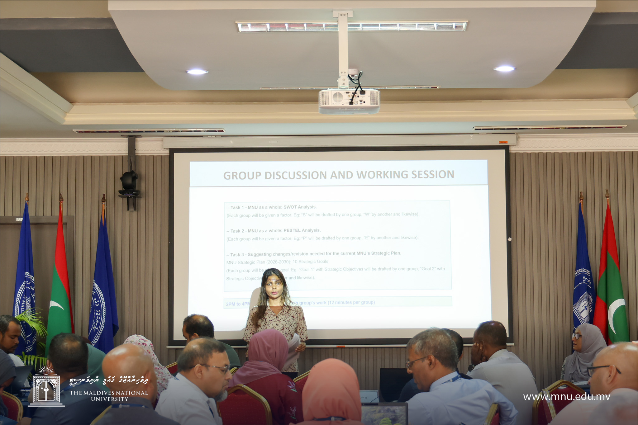 Key activities of the workshop included the development of SWOT and PESTEL analyses at an institutional level, enabling participants to assess MNU’s internal strengths and challenges, as well as external political, economic, social, technological, environmental, and legal factors influencing the University’s future. Participants also reviewed the existing Strategic Plan and proposed revisions and enhancements to ensure stronger alignment with emerging national priorities, global trends, and sustainability considerations.